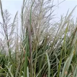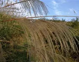 多年生,高大丛生草本。秆高1.5-3米,基部坚硬木质,花序以下部分具白色丝 蔗茅 状毛,有多数具髭毛的节,节下被白粉。叶鞘大多长于节间,上部或边缘被柔毛,鞘口生繸毛;叶舌质厚,长1-2毫米,顶端截平,具纤毛;叶片宽条形,长20-60厘米,宽1-2厘米,扁平或内卷,基部较窄,顶端长渐尖,无毛,下面被白粉,微粗糙,边缘粗糙, 中脉粗壮。圆锥花序大型直立,长20-30厘米,宽2-3厘米,主轴密生丝状柔毛;分枝稠密,长2-5厘米,二回分出小枝,总状花序轴节间与小穗柄长为小穗的2/3-3/4,边缘具长丝状毛;小穗长2.5-3.5毫米,基盘具白色或浅紫色,长为小穗3倍的丝状毛,第一颖厚纸质,脊间无脉,扁平,无毛,近边缘具一短脉,生丝状柔毛,顶端膜质,渐尖;第二颖稍长于第一颖,顶端膜质渐尖,具3脉,上部边缘具纤毛;第一外稃披针形,等长或稍短于颖,顶端尖或芒状,尤其在有柄小穗中芒长达6毫米,明显伸出于小穗之外;第二外稃长约1毫米,线状披针形,无毛,顶端延伸成芒,芒长10-14毫米,细直,微粗糙;第二内稃小,长约0.5毫米;雄蕊3枚,花药长约1毫米;柱头羽毛状,自小穗顶端之两侧伸出;鳞被2,无毛。染色体2n=20(Mahra et Sharma, 1975;Kalia, 1978)。花果期6-10月。