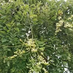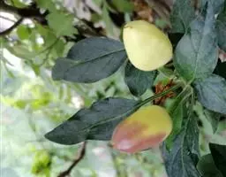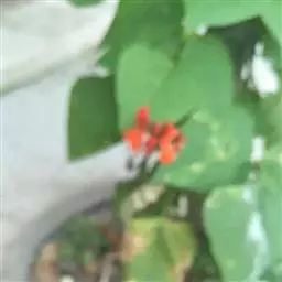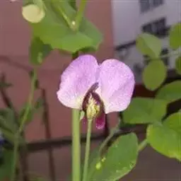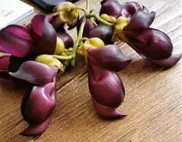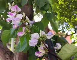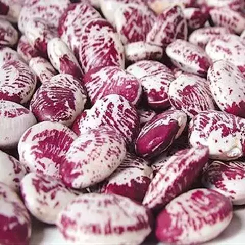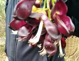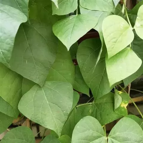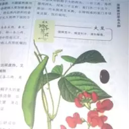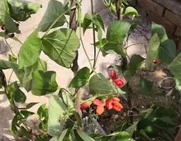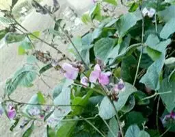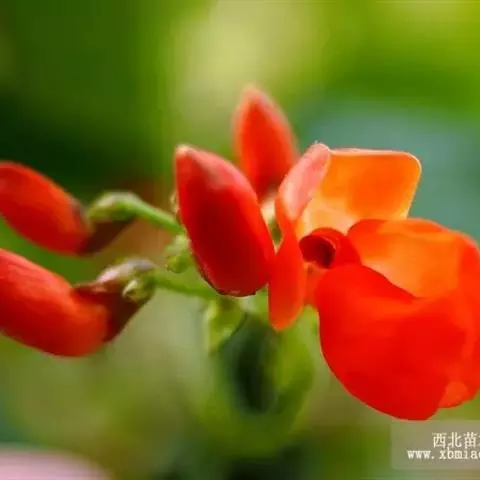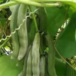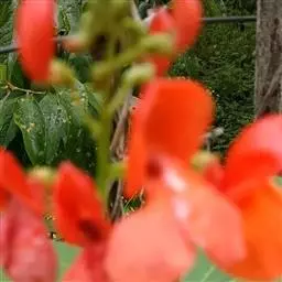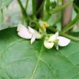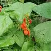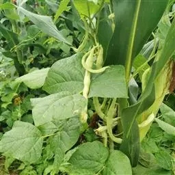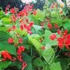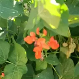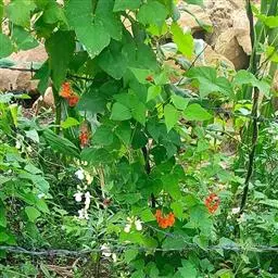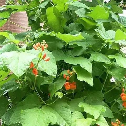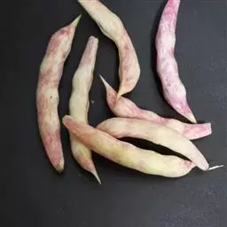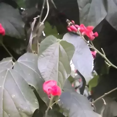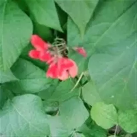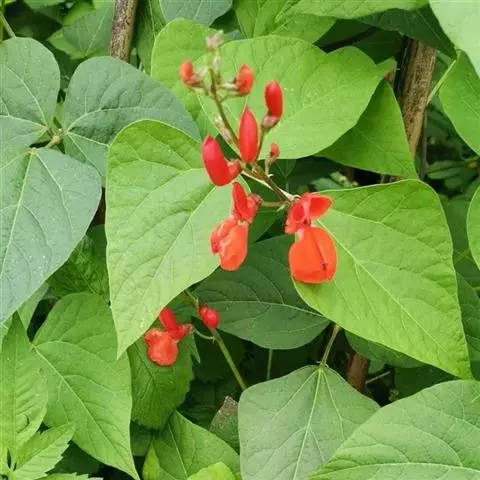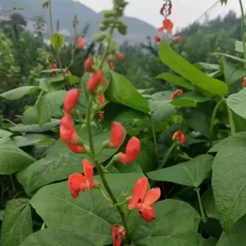 多花菜豆 多年生缠绕草本。在温带地区通常作一年生作物栽培,长可达5—7米。被毛或无毛。羽状复叶具3小叶;托叶小,不显著;小叶卵形或卵状菱形,长7.5-12.5厘米,宽有时过于长,先端渐尖或稍钝,两面被柔毛或无毛。花多朵生于较叶为长的总花梗上,排成总状花序;苞片长圆状披针形,通常和花梗等长,多少宿存,小苞片长圆状披针形,与花萼等长或较萼为长;花萼阔钟形,无毛或疏被长柔毛,萼齿远较萼管为短;花冠通常鲜红色,偶为白色,长1.5-2厘米。荚果镰状长圆形,长(5-)-16(-30)厘米,宽约1.5厘米;种子阔长圆形,长1.8-2.5厘米,宽1.2-1.4厘米,顶端钝,深紫色而具红斑、黑色或红色,稀为白色。