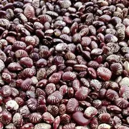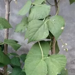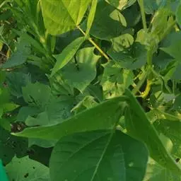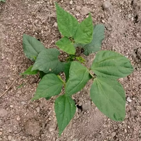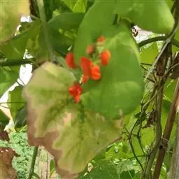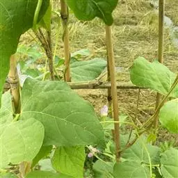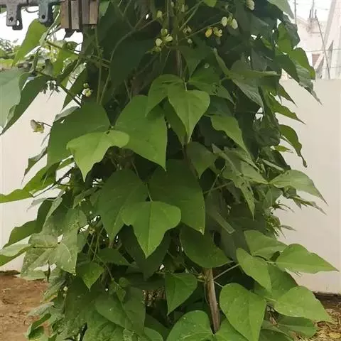 圆锥根系,幼茎有毛,开白花的幼茎绿色,开鲜红花的幼茎紫色,三出复叶,互生,复叶的叶柄长10-16cm,小叶的叶柄短,叶卵圆至棱形,全缘,叶面色绿,叶背灰白。腋生总状花序,花梗细长,有棱,着生小花的花轴比花梗长。小花对生。花冠大,色白或原红或鲜红,荚果略弯,成熟时褐黄色,每荚有种子2-4粒,多的可达9粒,种子宽肾形,凸扁,百粒重90-150g。粒色有单色及花色,脐大,长圆形,子叶浅黄多。