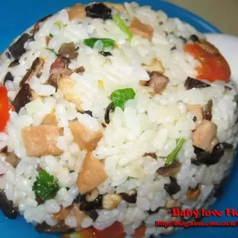 咸肉大概切丁是饭碗三分之二碗。米是九小把。多一点少一点都无所谓。但是不要太多就好。