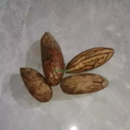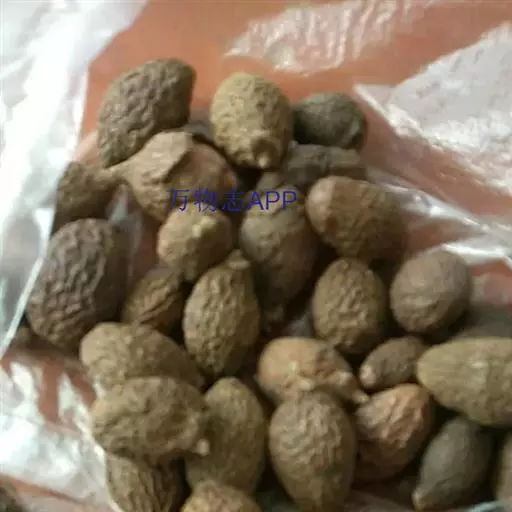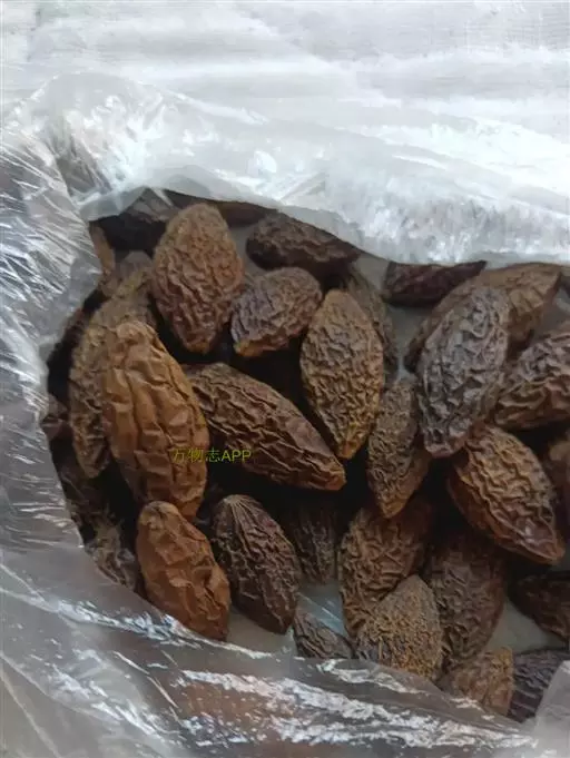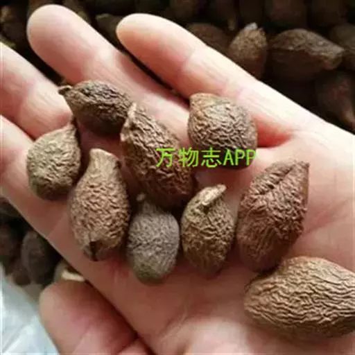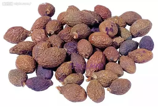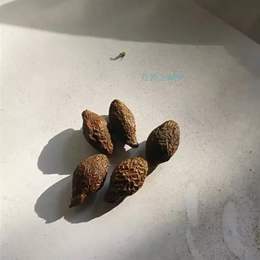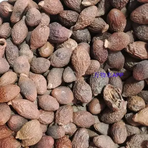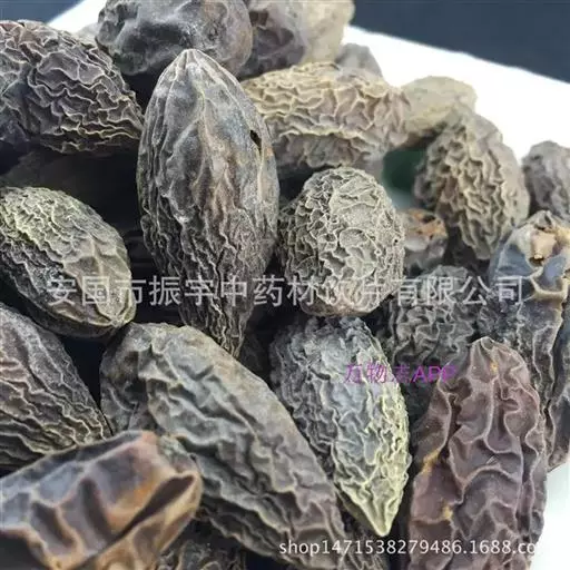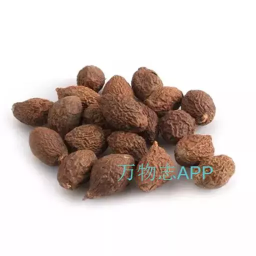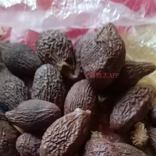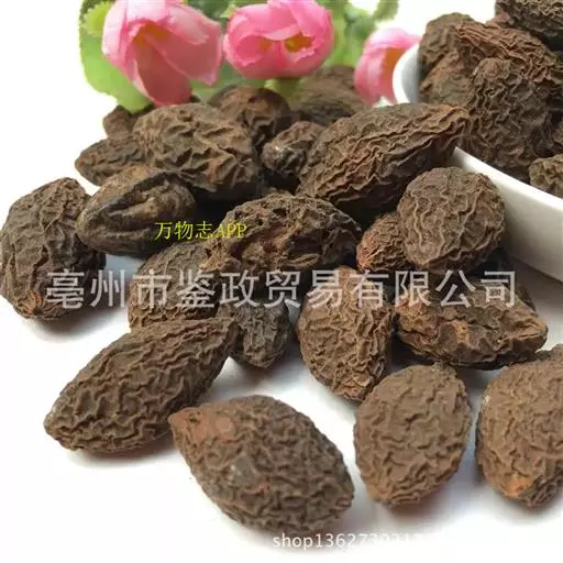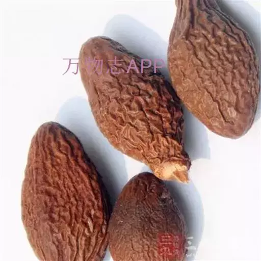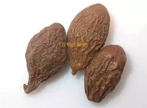呈纺锤形或椭圆形,长2~3cm,直径1~1.5cm。先端钝圆,基部略尖而歪,具浅色的圆形种脐,表面棕色或暗棕色,微有光泽,具不规则的干缩皱纹。外层果皮极薄,质脆,易脱落。中层果皮较厚,黑褐色,质松易碎,遇水膨胀成海绵状。断面可见散在的树脂状小点。内层果皮可与中层果皮剥离,稍革质,内有2片肥厚胚乳,广卵形;子叶2枚,菲薄,紧贴于胚乳内侧,与胚乳等大。气微,味淡,嚼之有黏性。