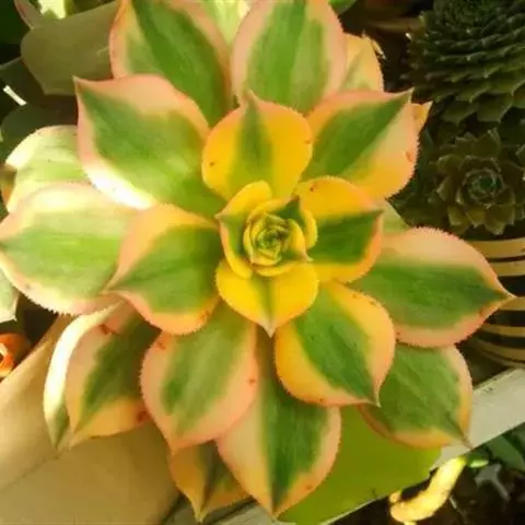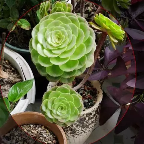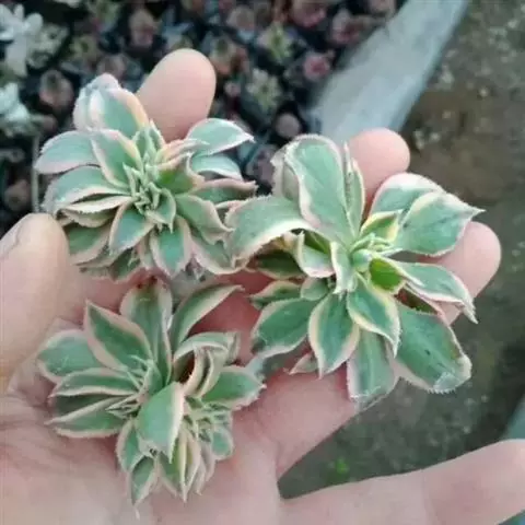 红缘莲花掌 多年生肉质草本植物,植株呈多分枝的亚灌木状,高25~50厘米,分枝顶端的叶子排列成莲座状。叶片倒卵形,具细尖,叶长2.5~5厘米,质稍厚,蓝绿至灰绿色,被白霜,叶面具光泽,叶缘红色至红褐色,并有细齿。聚伞花序,花浅黄色,有时带红晕。莲花掌为莲花掌属植物,植株多分枝,肉质叶在枝头排成莲座状,叶片较薄,形状有倒卵形、舌形、肾形,叶缘有短毛,总状花序,花后植株枯死。