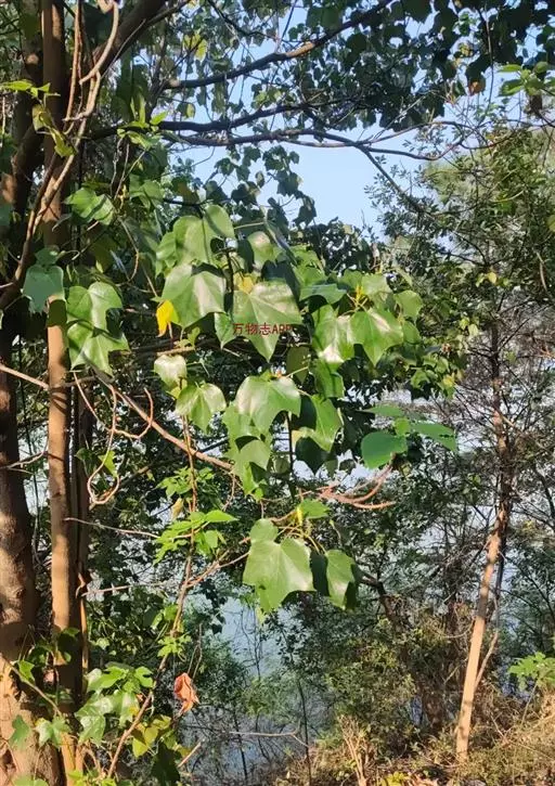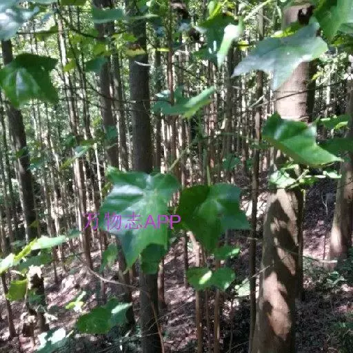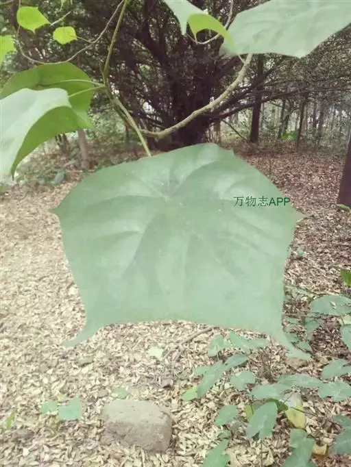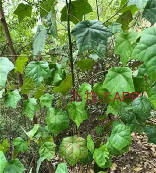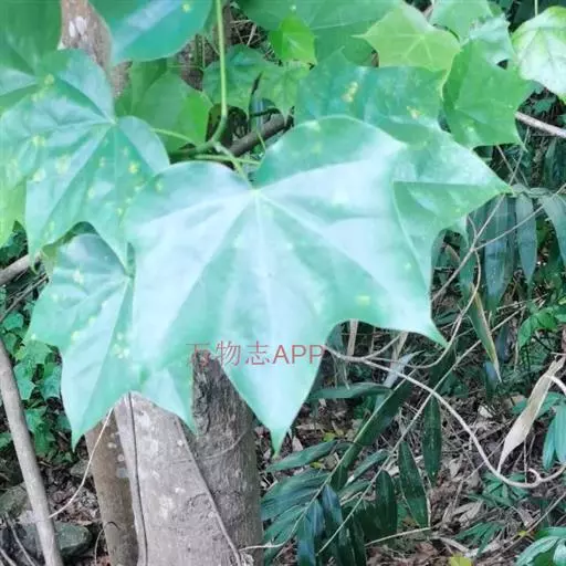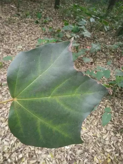 常绿乔木,高达30米;小枝粗壮,无毛,节膨大,有环状托叶痕。叶革质,阔卵圆形,全缘,或幼叶先端3浅裂,长10-13厘米,宽7-10厘米,先端短尖,基部心形;上面干后橄榄绿色,有光泽;下面黄绿色,或稍带灰色,无毛;掌状脉5条,在上面明显,在下面突起,网脉不大明显;叶柄长7-10厘米,圆筒形,无毛。