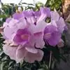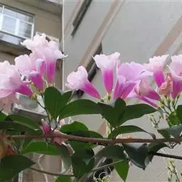 粉花凌霄,为紫葳科粉花凌霄属植物,有白花和红花等栽培品种。在适宜生长的温暖地带,可用于棚架、墙垣绿化,寒地可行盆栽。全株可入药。