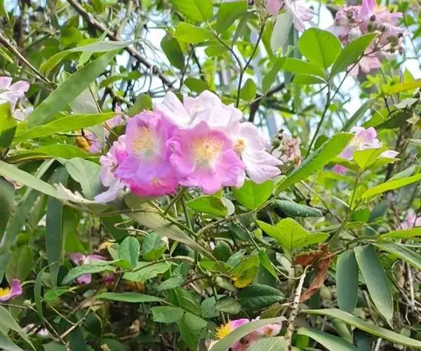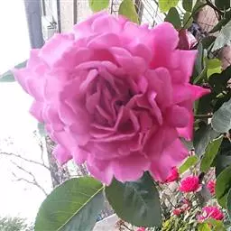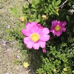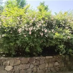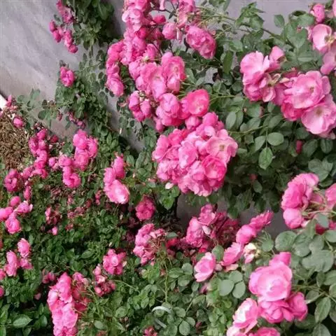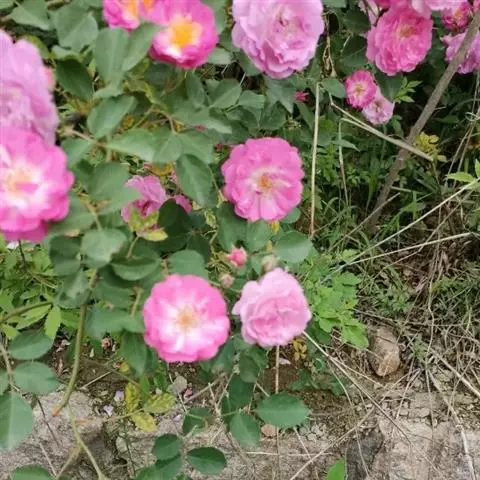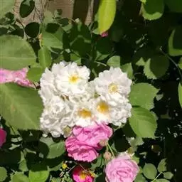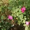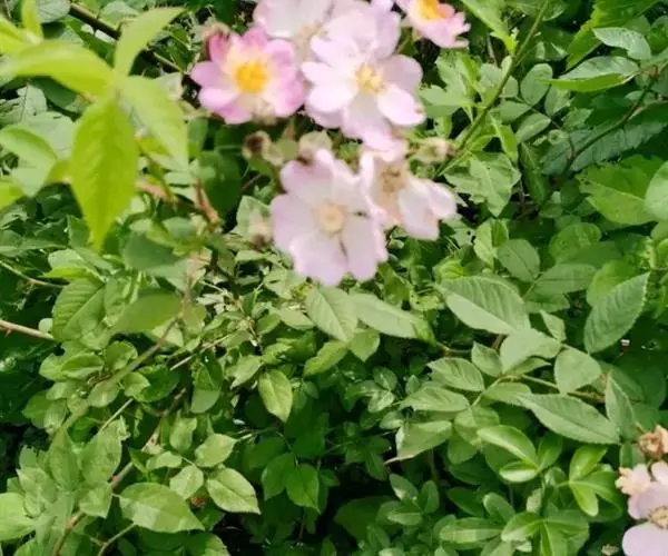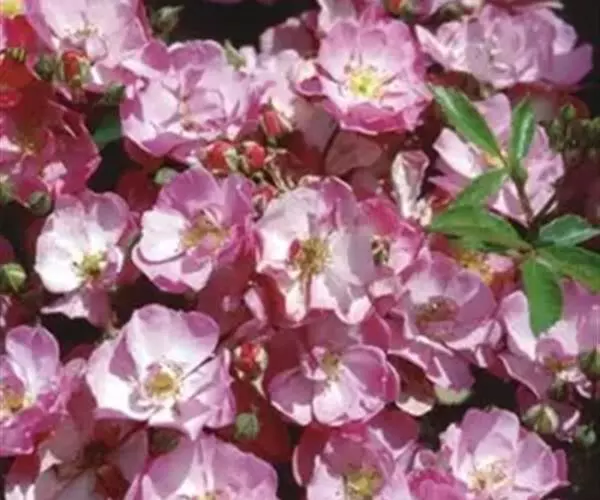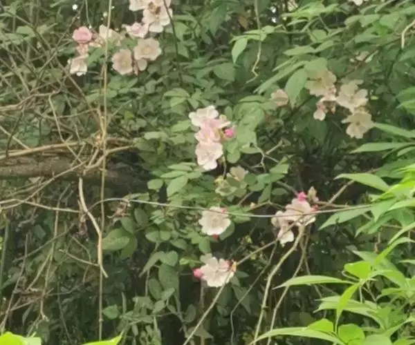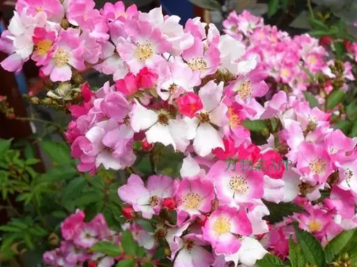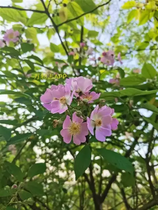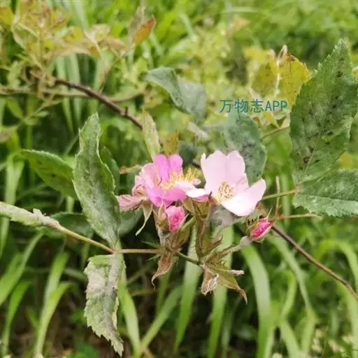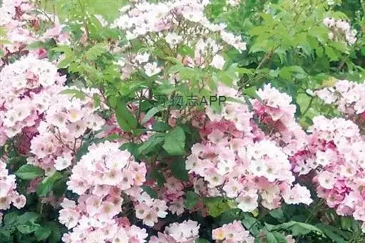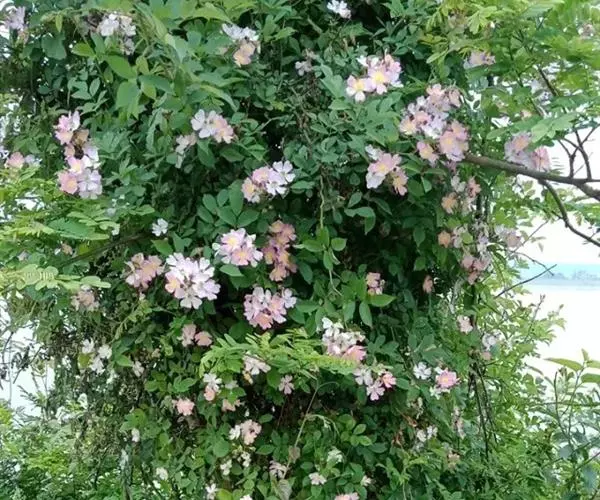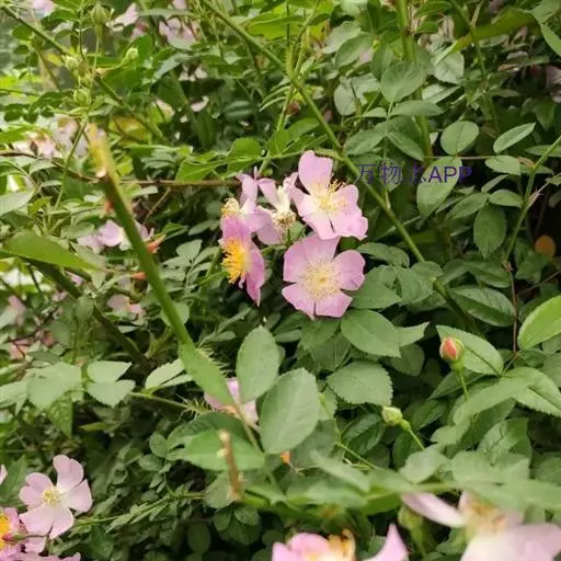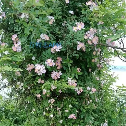 粉团蔷薇(学名:Rosa multiflora Thunb. var. cathayensis Rehd. ):攀援灌木;小枝圆柱形,通常无毛,小叶倒卵形、长圆形或卵形,边缘有尖锐单锯齿,上面无毛,下面有柔毛;花多朵,排成圆锥状花序,花直径1.5-2厘米,萼片披针形,花瓣宽倒卵形,先端微凹,基部楔形;花柱结合成束,无毛,比雄蕊稍长。果近球形,红褐色或紫褐色,有光泽,无毛,萼片脱落。系野蔷薇的一个变种,小叶较大,通常5-7。花粉红,花较大,单瓣,平顶伞房花序。果实较小,少种子或无种子。