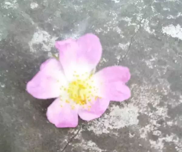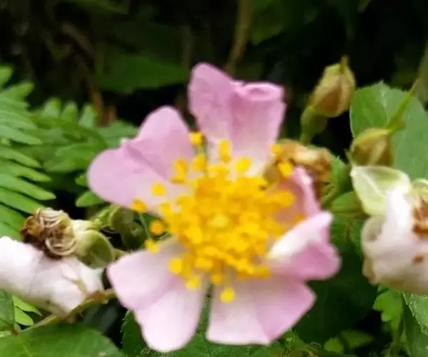 花多朵,排成圆锥状花序,花梗长1.5-2.5厘米,无毛或有腺毛,有时基部有篦齿状小苞片;花直径1.5-2厘米,萼片披针形,有时中部具2个线形裂片,外面无毛,内面有柔毛;花瓣粉红色,单瓣,宽倒卵形,先端微凹,基部楔形;花柱结合成束,无毛,比雄蕊稍长。果近球形,直径6-8毫米,红褐色或紫褐色,有光泽,无毛,萼片脱落。