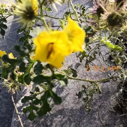 黄花刺茄又叫刺萼龙葵,为茄科茄属一年生草本植物。一年生草本,高30-70厘米。茎直立,基部稍木质化,自中下部多分枝,密被长短不等带黄色的刺,刺长0.5-0.8厘米,并有带柄的星状毛。叶互生,叶柄长0.5-5厘米,密被刺及星状毛;叶片卵形或椭圆形,长8-18厘米,宽4-9厘米,不规则羽状深裂及部分裂片又羽状半裂,裂片椭圆形或近圆形。先端钝,表面疏被5-7分叉星状毛、背面密被5-9分叉星状毛,两面脉上疏具刺,刺长3-5毫米。