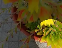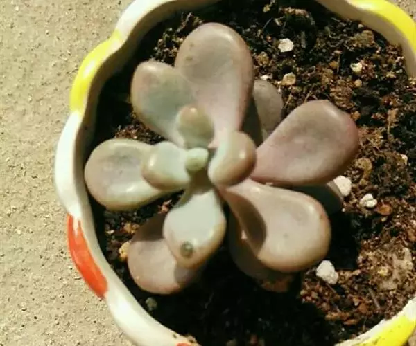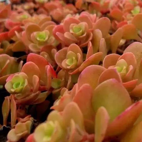 表面附蜡质呈黄绿色或金黄色偏红,长期生长于阴凉处时叶片呈绿色,光照充足情况下,叶片边缘会泛红,花单瓣,聚伞花序,浅黄色,较少开花。