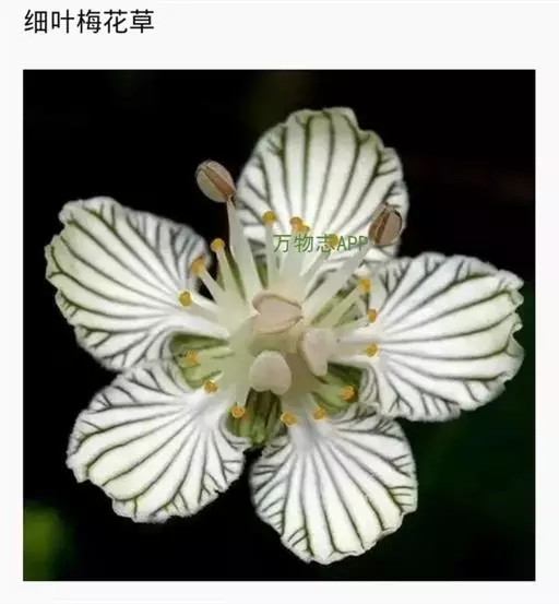 梅花草,中药名。为蔷薇科梅花草属植物梅花草Parnassia palustris Linn.的全草。植物梅花草,分布于东北、华北及陕西甘肃、青海等地。具有清热凉血,解毒消肿,止咳化痰之功效。主治黄疸型肝炎,细菌性痢疾,咽喉肿痛,脉管炎,疮痈肿毒,咳嗽痰多。