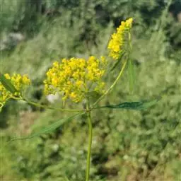 糙叶败酱( Patrinia rupestris Juss.subsp.scabra H.J.Wang),败酱科植物,多年生草本,茎丛生,茎上部多分枝,叶对生,裂片倒披针形、狭披针形或长圆形,聚伞花序顶生,呈伞房状排列,花小,黄色,花冠合瓣,果实翅状,卵形或近圆形,种子位于中央。