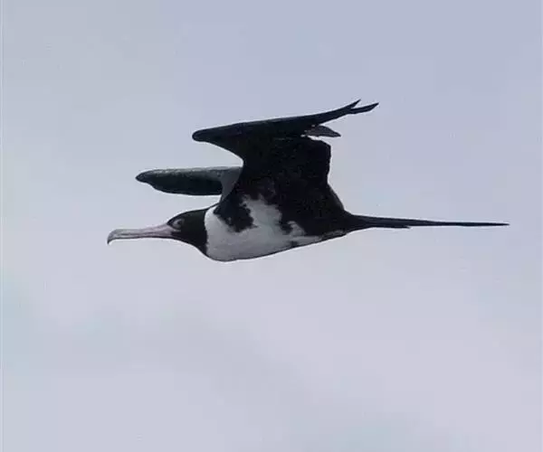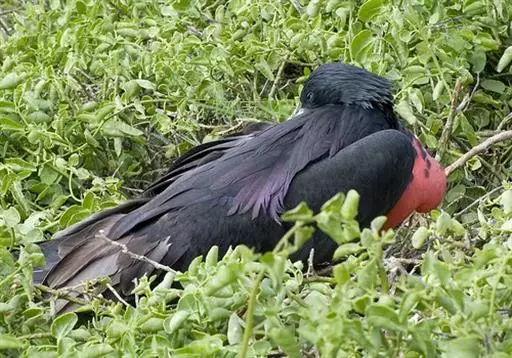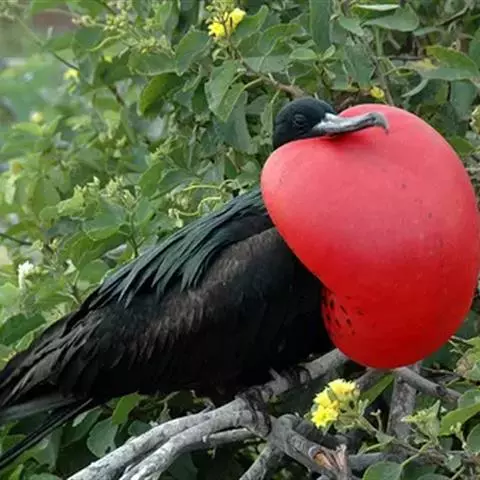 阿岛军舰鸟体形轻盈,翼展宽阔,善展翅滑翔。 阿岛军舰鸟 和其他军舰鸟一样:有很长的深叉形尾巴,嘴尖弯曲成钩状,尖翅显著。 阿岛军舰鸟大型海鸟,体长89~96厘米。成年雄鸟全身黑色,且具绿色和紫色的油亮光泽。喉囊鲜红色,求偶期会鼓胀如心形气球状。成年雌鸟偏锈棕色,尤其在颈、胸周围最为明显,某些个体的胸、腹部会出现白色斑块。 幼鸟与成年雌鸟外形相似,幼鸟头部白色是主要的区别特征。