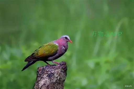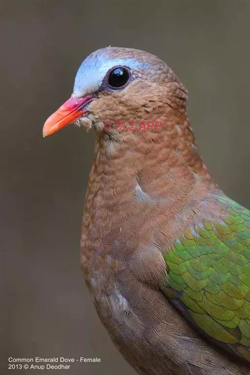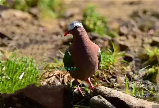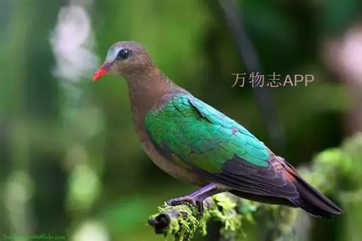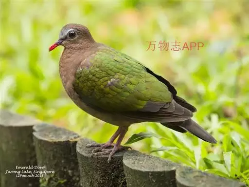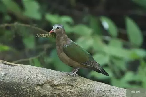 中等体型(25厘米)、尾甚短的地栖型斑鸠。下体粉红,头顶灰色,额白,腰灰,两翼具亮绿色。雌鸟头顶无灰色。飞行时背部两道黑色和白色的横纹清晰可见。 虹膜-褐色;嘴-红色,嘴尖橘黄;脚-红色。