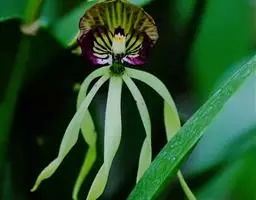 凤梨科铁兰属,草本植物,植株下垂生长,茎长,纤细;叶片互生,半圆形,长3~4cm,密被银灰色鳞片;小花腋生,黄绿色,花萼紫色,小苞片褐色,花芳香。