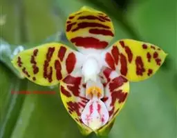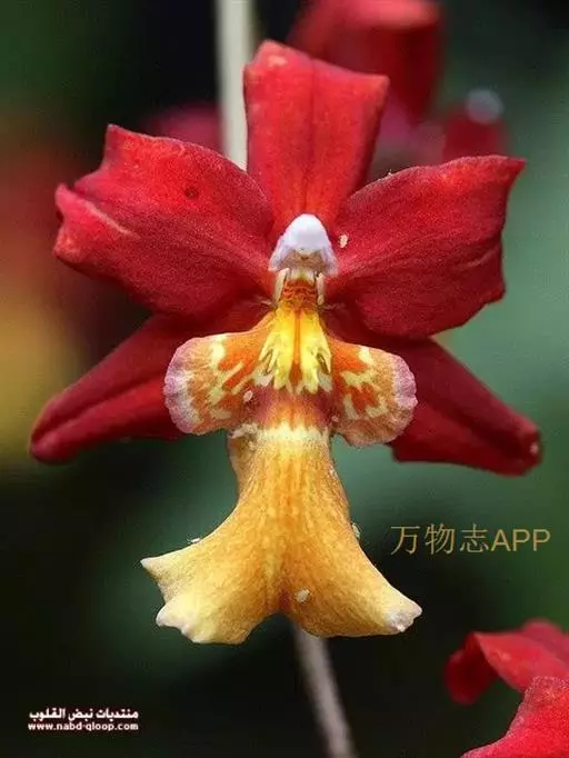 金蝶兰(O.Papilio),花瓣深红色、有黄色横条纹,唇瓣黄色、具褐红色斑点。