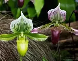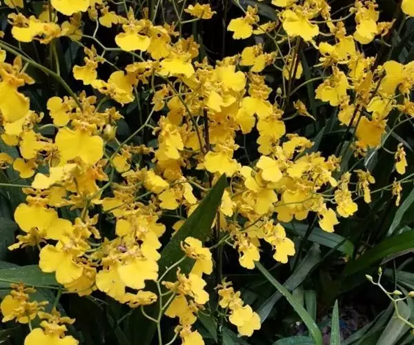 华彩文心兰(O.Splendidum),花黄色、具棕色条纹,唇瓣大、金黄色。