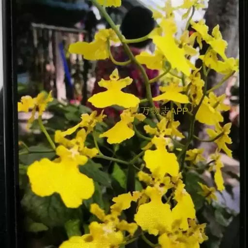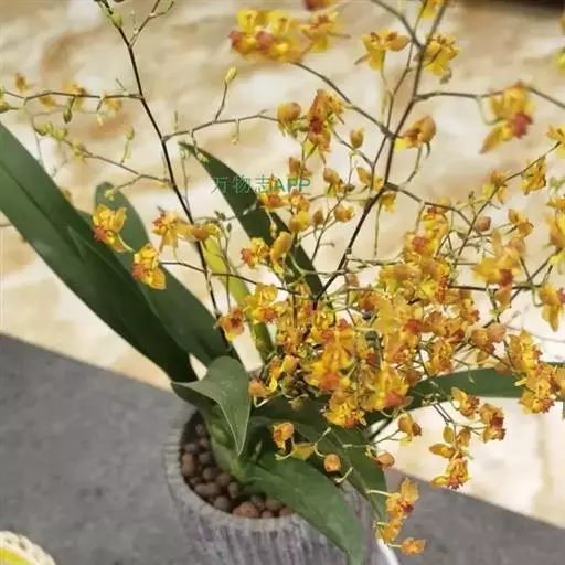 文心兰(Oncidium hybridum),又名吉祥兰,跳舞兰、舞女兰、金蝶兰、瘤瓣兰等,叶片1~3枚,可分为薄叶种,厚叶种和剑叶种。兰科中的文心兰属植物的总称,本属植物全世界原生种多达750种以上,而商业上用的千姿百态的品种多是杂交种,植株轻巧、潇洒,花茎轻盈下垂,花朵奇异可爱,形似飞翔的金蝶,极富动感,是世界重要的盆花和切花种类之一。它的故事波及深远,相传宋美龄访白宫之时,一见钟情于此花,发现花瓣像极了中国汉字中的“吉”字,寓意吉祥,因此取名为“吉祥兰”。