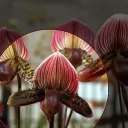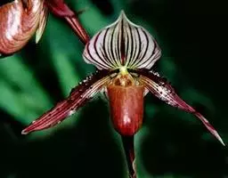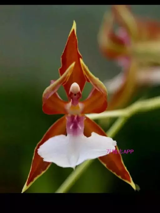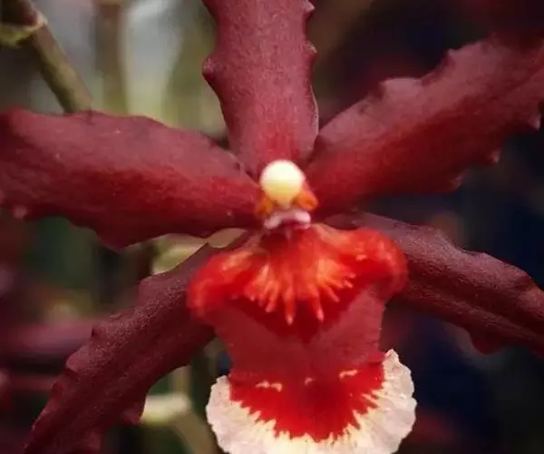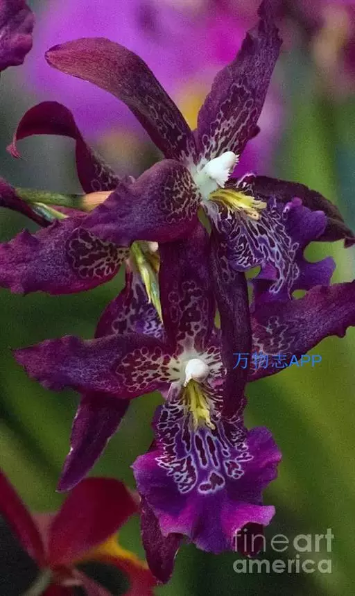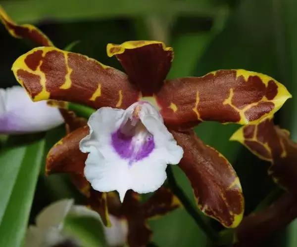 皱状文心兰(O.Crispum),花大,皱瓣,花径8厘米,花瓣褐色具金黄色中心。