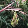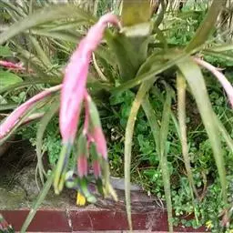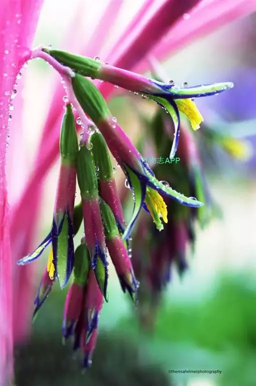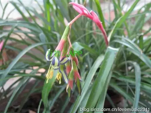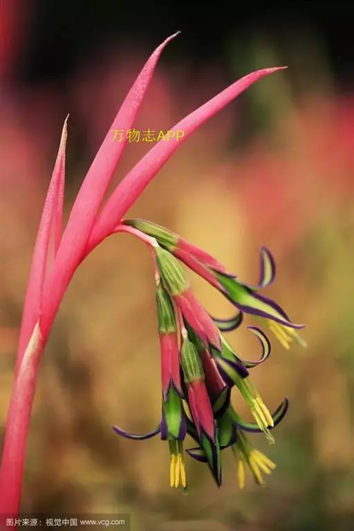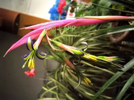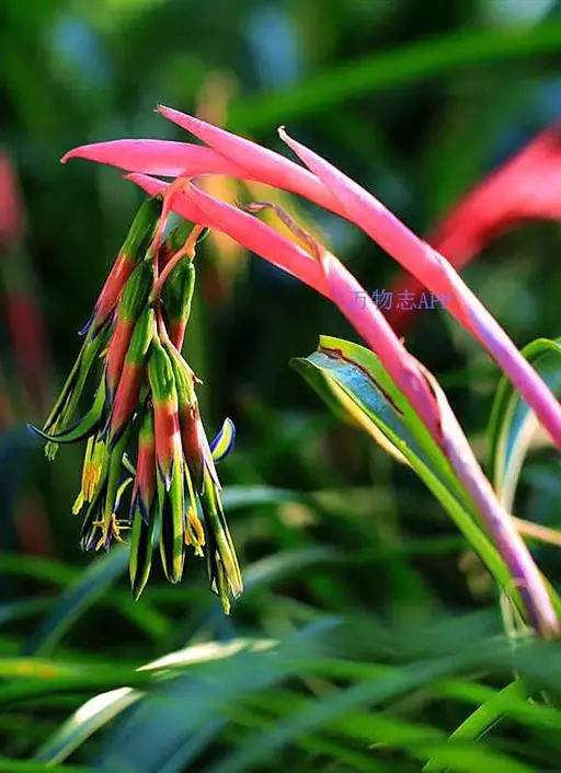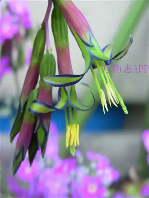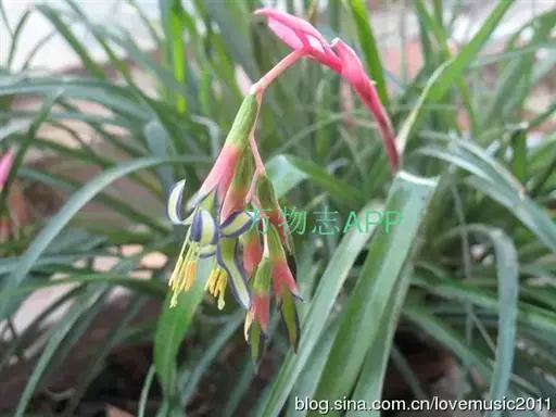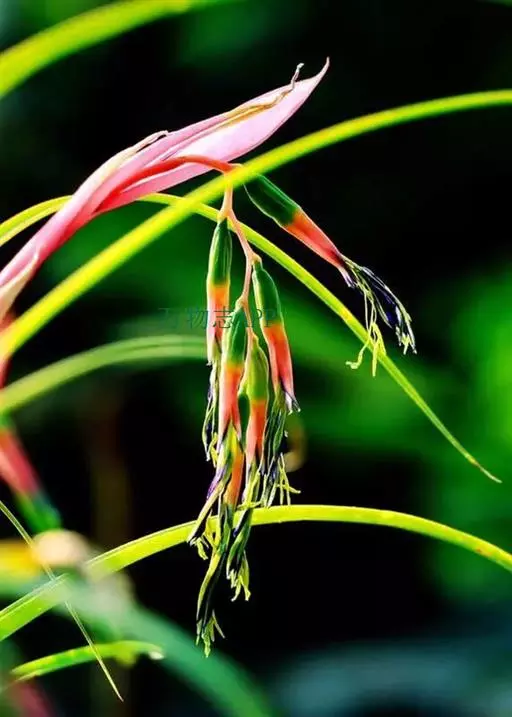 垂花水塔花(Billbergia nutans Wendl.)凤梨科观赏植物,茎极短。叶莲座状丛生,长达50厘米,先端下垂,叶缘有疏小刺;花葶长30厘米,先端下垂,具花4-12朵,无毛,花序轴膝状折曲;总苞片狭、紧贴花葶,粉红色到淡红色;花萼3枚,橙红色,边缘蓝紫色,花瓣3枚,绿色,边缘蓝紫色,先端急尖,反折;雄蕊6枚;花药伸出花外;子房下位,绿色,中轴胎座,柱头扭转。种子多数,小。