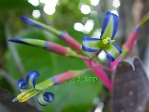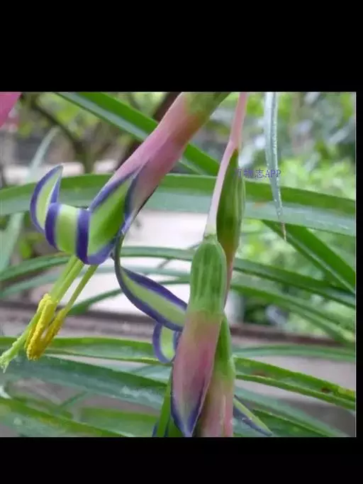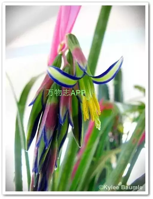 茎极短。叶莲座状丛生,长达50厘米,宽15毫米,先端下垂,叶缘有疏小刺;花葶长30厘米,先端下垂,具花4-12朵,无毛,花序轴膝状折曲;总苞片狭、紧贴花葶,粉红色到淡红色;花萼3枚,长1.3-2.7厘米,橙红色,边缘蓝紫色,花瓣3枚,长3.6-4厘米,绿色,边缘蓝紫色,先端急尖,反折;雄蕊6枚;花药长7毫米,伸出花外;子房下位,绿色,长1厘米,中轴胎座,柱头扭转。种子多数,小。