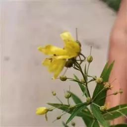 花单生叶腋;花梗长1-5厘米,通常不超过叶长,毛被如茎,多少具褐色无柄腺体;花萼长(4)5-7(10)毫米,分裂近达基部,裂片披针形、椭圆状披针形以至线形或上部稍扩大而近匙形,先端锐尖或稍钝,无毛、被柔毛或仅边缘具缘毛;花冠黄色,长7-15毫米,基部合生部分长2-4毫米,裂片狭卵形以至近披针形,先端锐尖或钝,质地稍厚,具黑色长腺条;花丝长6-8毫米,下半部合生成筒;花药卵圆形,长1-1.5毫米;花粉粒具3孔沟,近球形[(29.5-32)×(27-31)微米],表面具网状纹饰;子房卵珠形,花柱长6-8毫米。蒴果球形,直径4-5毫米,无毛,有稀疏黑色腺条。花期5-7月,果期7-10月。