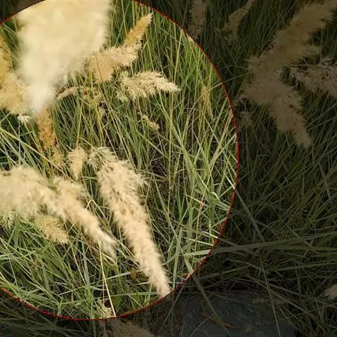 圆锥花序紧密似香蒲花序,长40-50厘米,宽1.5-2.5厘米;主轴粗壮,硬直,密生柔毛;总梗长2-5毫米,密生柔毛;小穗通常双生于一总苞内成束,倒卵形,长3.5-4.5毫米,基部稍两侧压扁;刚毛短于小穗,粗糙或基部生柔毛;颖膜质,具细纤毛;第一颖微小,长约0.8毫米;第二颖长1.5-2毫米,具3脉;第一小花雄性,第一外稃长约2.5毫米,先端截平,边缘膜质,具纤毛,具5脉,内稃薄纸质,遍生细毛;第二小花两性,第二外稃长约3毫米,先端钝圆,具纤毛,具5-6脉(基部不明显);鳞被退化;雄蕊3,花药顶端具毫毛。颖果近球形或梨形,成熟时膨大外露,长约3毫米;花柱基部联合。叶表皮细胞结构为上下表皮不同型;上表皮脉间最中间2-3行为短筒状六角形或五角形、壁薄、无波纹或微波纹长细胞,邻近1-3行为壁厚、深波纹长细胞,靠叶脉2-3行为长筒状壁厚、有波纹的长细胞与短细胞交叉排列;下表皮为壁厚、有波纹的长细胞与短细胞交叉排列。染色体2n=14 (Rou N.,1929b; Karper,Chisholm, 1936; Burton, 1942; Krisbnaswamy,1951)。花果期9-10月。
