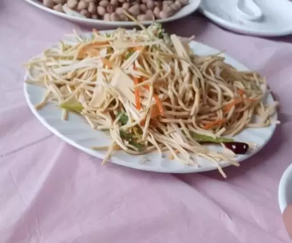 阳泉市所属平定县有道名菜:粉条豆腐丝。这道菜主料是粉条和油豆腐丝,成菜特点是,豆腐丝是炸过的,外脆里嫩,菜看着很温和,没有一点热菜的感觉,但吃起来烫嘴,所以,地道的饭店都会说,我们做得是不冒烟的正宗粉条豆腐丝。此菜是阳泉、晋中一带一般人家红白喜事,请客吃饭都会有的一道传统菜。近些年各饭店推出的深受老百姓喜欢的创新菜--茴子白炒粉条与粉条豆腐丝有异曲同工之妙。