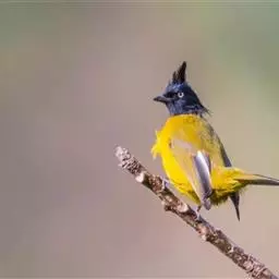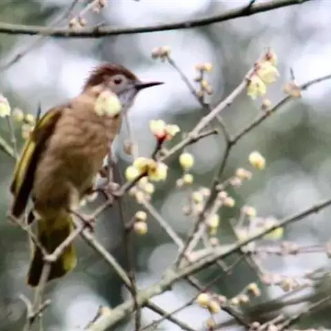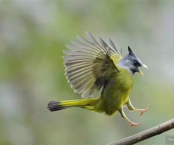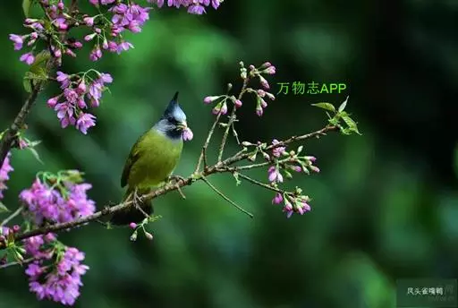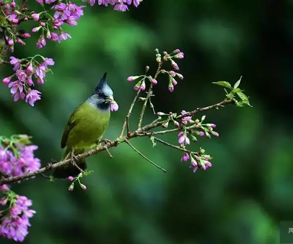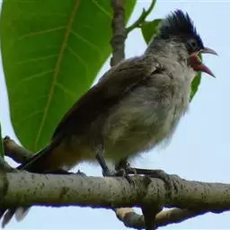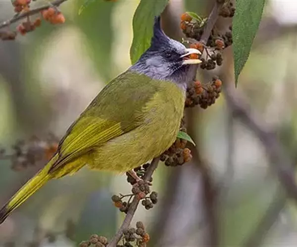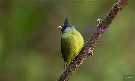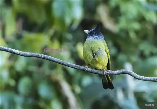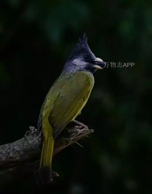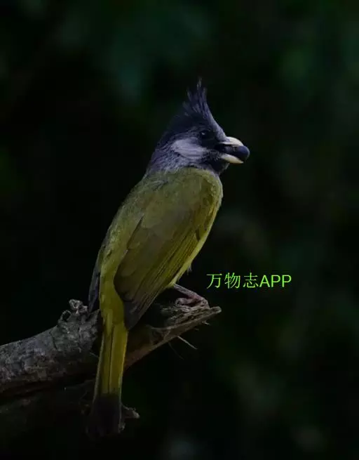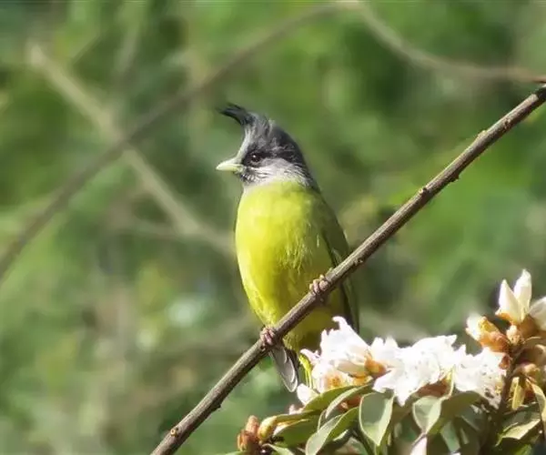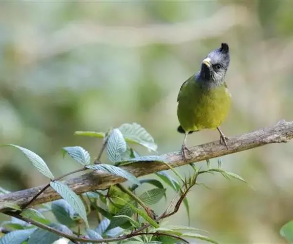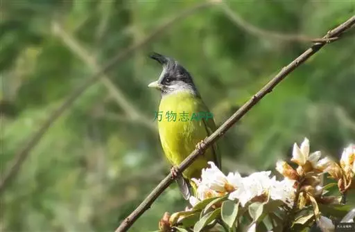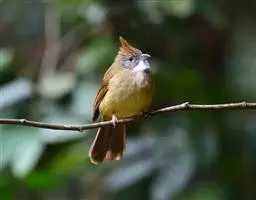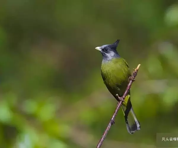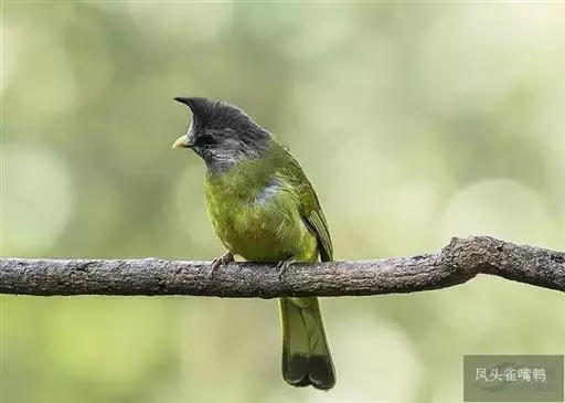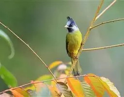 凤头雀嘴鹎(学名:Spizixos canifrons):属小型鸟类,体长18-22厘米。嘴粗短、呈象牙色或乳黄色,前额和脸灰色,头顶黑色,有一朝前竖立的黑色羽冠。上体橄榄绿色,下体黄绿色,尾羽黄绿色具宽阔的黑褐色端斑。
