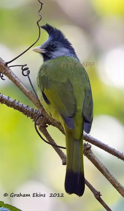 灰短脚鹎,体长19-22厘米。头顶和短的羽冠黑色,上体暗灰色,耳羽灰褐色,两翅表面橄榄绿黄色。…