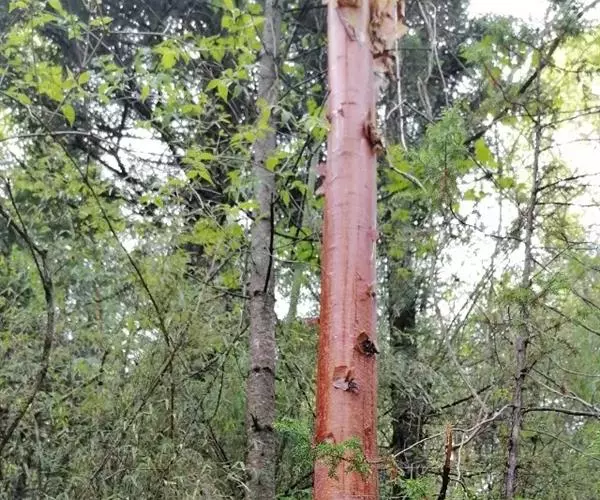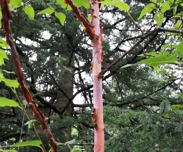 大乔木,高可达30米;树皮淡红褐色或紫红色,有光泽和白粉,呈薄层状剥落,纸质;枝条红褐色,无毛;小枝紫红色,无毛,有时疏生树脂腺体;芽鳞无毛,仅边缘具短纤毛。