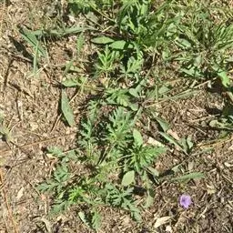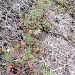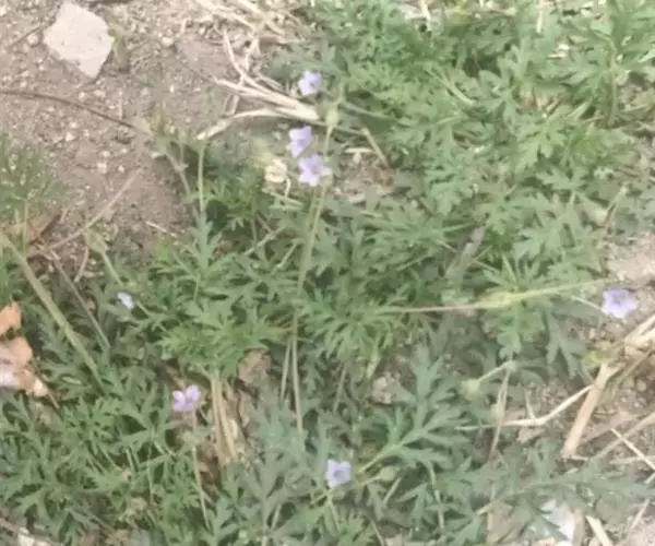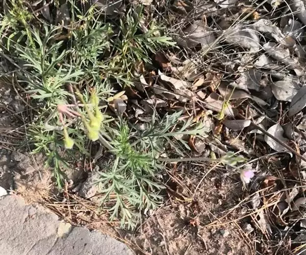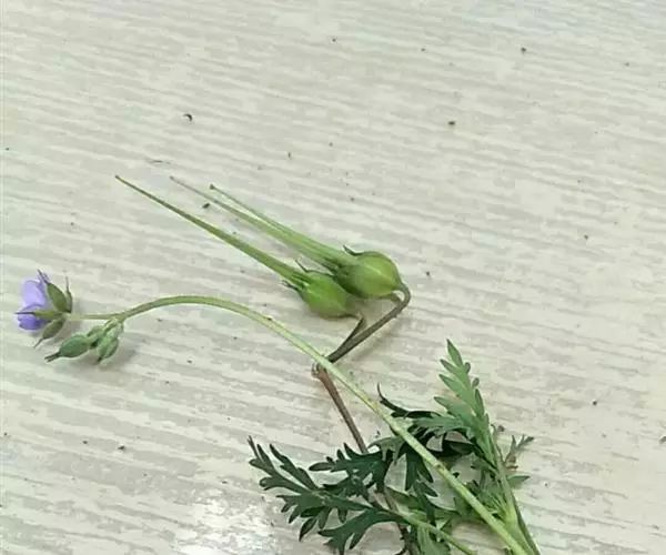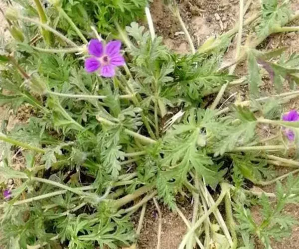 牻牛儿苗(Erodium stephanianum Willd.),多年生草本,高通常15-50厘米,叶对生,托叶三角状披针形,全缘或具疏齿,表面被疏伏毛,背面被疏柔毛,伞形花序,花瓣紫红色,倒卵形,蒴果长约4厘米,种子褐色,具斑点。花期6-8月,果期8-9月。牻牛儿苗分布广泛,生于干山坡、农田边、沙质河滩地和草原凹地等。