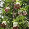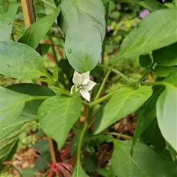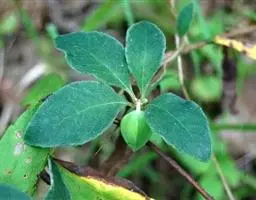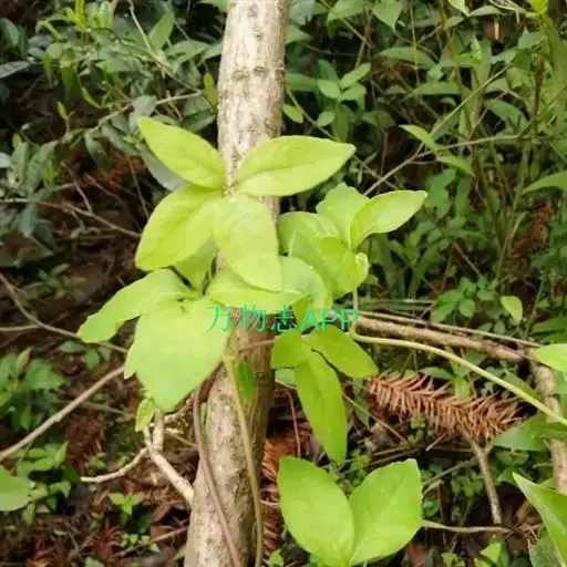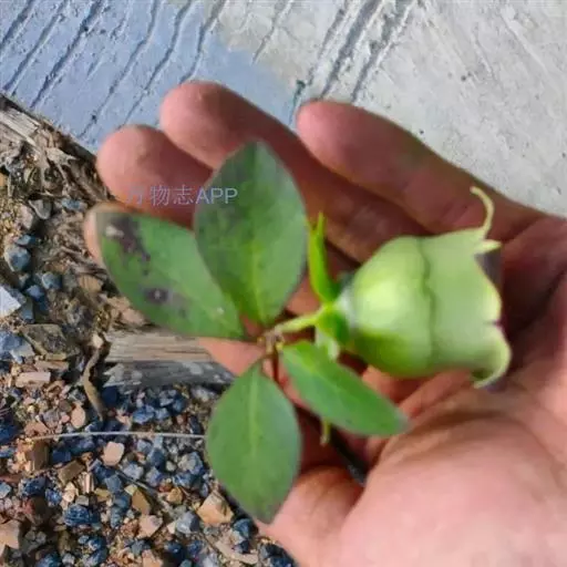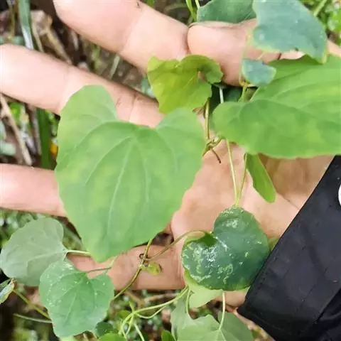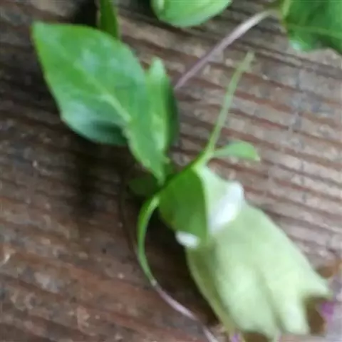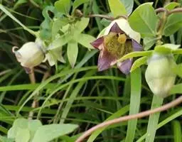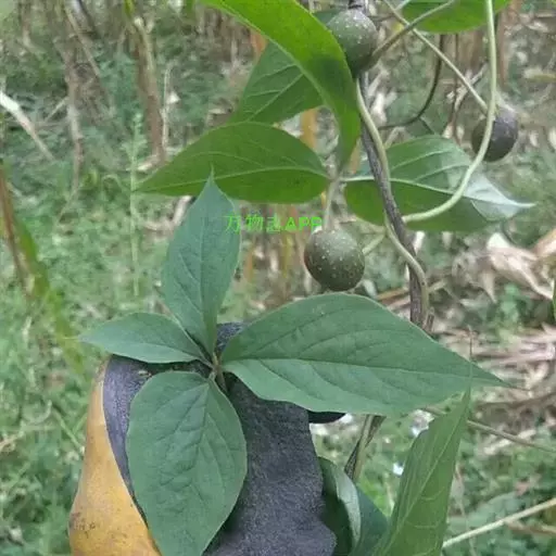 羊乳花 植株全体光滑无毛或茎叶偶疏生柔毛。茎基略近于圆锥状或圆柱状,表面有多数瘤状茎痕,根常肥大呈纺锤状而有少数细小侧根,长约10-20厘米,直径1-6厘米,表面灰黄色,近上部有稀疏环纹,而下部则疏生横长皮孔。茎缠绕,长约1米,直径3-4毫米,常有多数短细分枝,黄绿而微带紫色。叶在主茎上的互生,披针形或菱状狭卵形,细小,长0.8-1.4厘米,宽3-7毫米;在小枝顶端通常2-4叶簇生,而近于对生或轮生状,叶柄短小,长1-5毫米,叶片菱状卵形、狭卵形或椭圆形,长3-10厘米,宽1.3-4.5厘米,顶端尖或钝,基部渐狭,通常全缘或有疏波状锯齿,上面绿色,下面灰绿色,叶脉明显。花单生或对生于小枝顶端;花梗长1-9厘米;花萼贴生至子房中部,筒部半球状,裂片湾缺尖狭,或开花后渐变宽钝,裂片卵状三角形,长1.3-3厘米,宽0.5-1厘米,端尖,全缘;花冠阔钟状,长2-4厘米,直径2-3.5厘米,浅裂,裂片三角状,反卷,长约0.5-1厘米,黄绿色或乳白色内有紫色斑;花盘肉质,深绿色;花丝钻状,基部微扩大,长约4-6毫米,花药3-5毫米;子房下位。蒴果下部半球状,上部有喙,直径约2-2.5厘米。种子多数,卵形,有翼,细小,棕色。花果期7-8月。