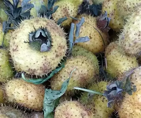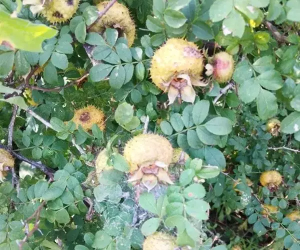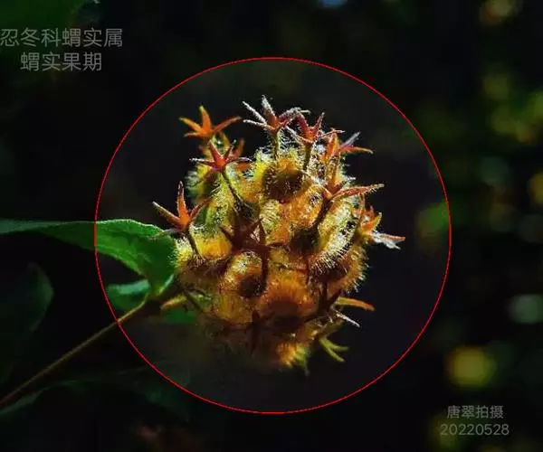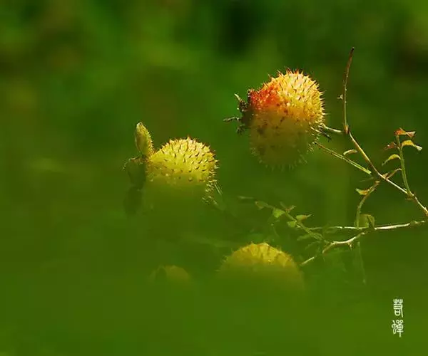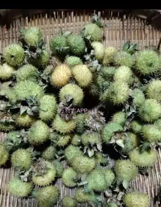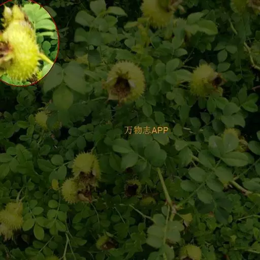 果扁球形,直径3-4厘米,绿红色,外面密生针刺;萼片宿存,直立。花期5-7月,果期8-10月。