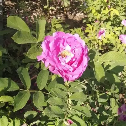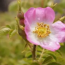 缫丝花花朵秀美,粉红的花瓣中密生一圈金黄色花药,十分别致,黄色刺颇具野趣,适用于坡地和路边丛植绿化,也用作药蓠材料。