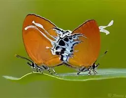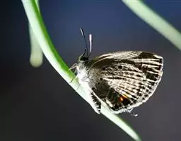 点玄灰蝶 小玄灰蝶的外观特征如下:翅膀正面黑褐色,隐约可见后翅亚外缘有蓝斑一列,另有一条短细尾突。翅膀的反面呈灰白色,缘毛白色。前翅反面外缘线黑色,内有两列黑斑,中室内外有3个黑斑;后翅反面外缘线褐色,内有围绕橙红色的两列黑斑,排成弧形,中室内外也有3个黑斑,而与其他近缘种有着根本区别。点玄灰蝶的生物学特性——独特的藏匿行为的观察与研究。