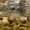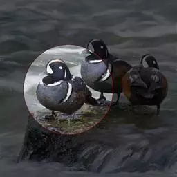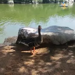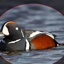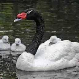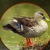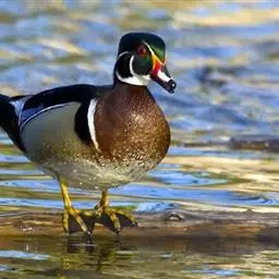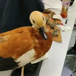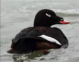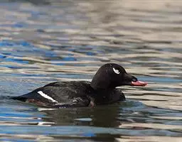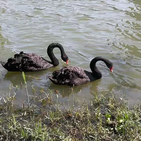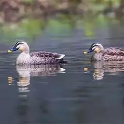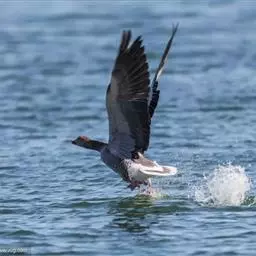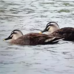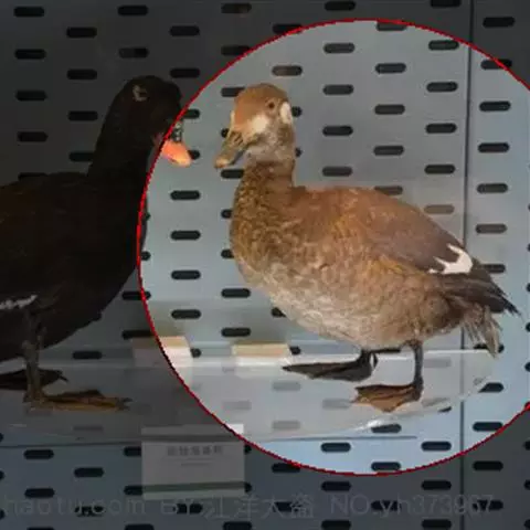 麝鸭(学名:Biziura lobata):雄性麝鸭是澳大利亚最大的水鸭,具有强壮的体形,羽色黯淡。嘴部有瘤疣附生物,羽毛散出一种近似麝香的香气(尾脂腺分泌物)。属于硬尾鸭亚科,具有长而坚硬的尾羽,游泳时尾羽可没入水中,而有时尾羽可以竖起,如同扇子的形状。主要吃植物性食物,也吃水生昆虫、甲壳类、青蛙等水生动物。