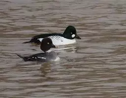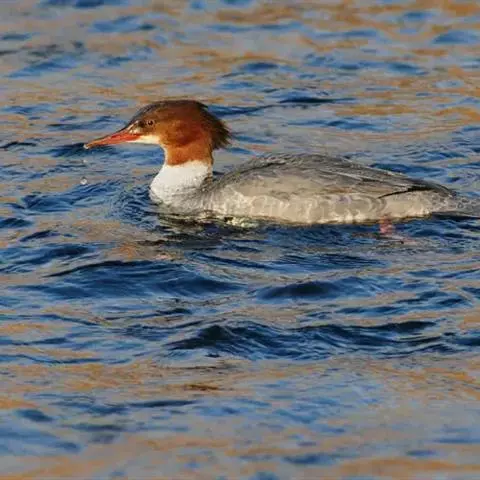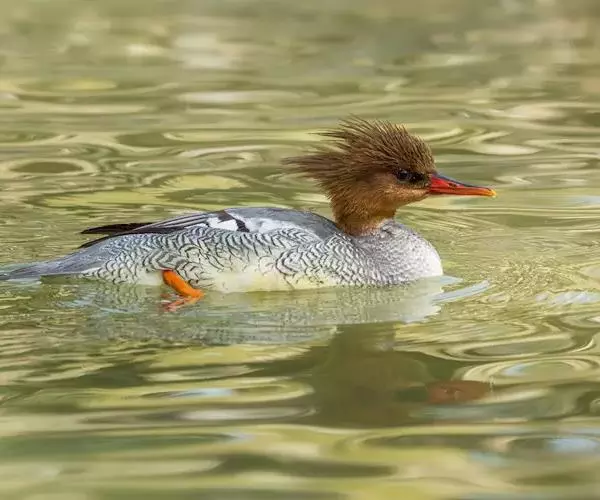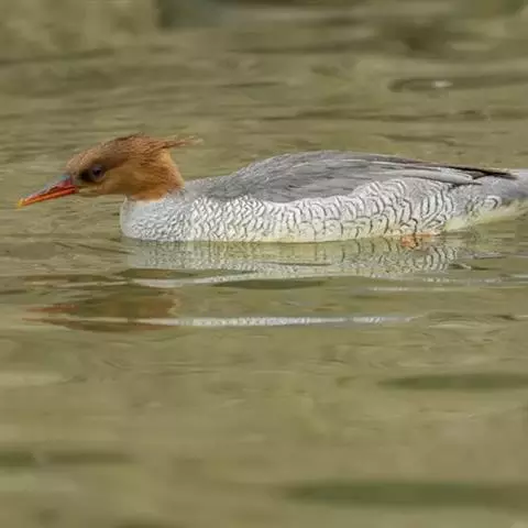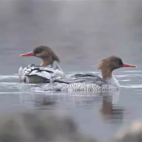 雌鸟的头和颈棕褐色;上背褐色;下背、腰和尾上覆羽由褐色逐渐变为灰色,并具白色横斑;尾黑褐色,沾灰色;下体白色,肩和下体两侧具鳞状斑。色暗而多灰色,与红胸秋沙鸭的区别在于体侧具同轴而灰色宽黑色窄的带状图案。