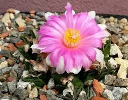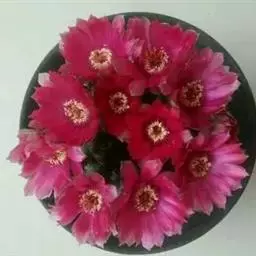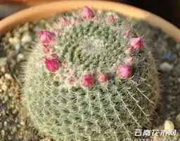 绯花玉 Speg.)是仙人掌科、裸萼球属多肉植物,植株呈扁球形,表皮墨绿色,刺针状,…