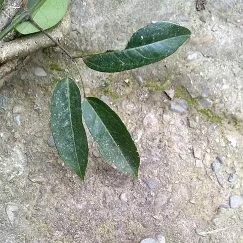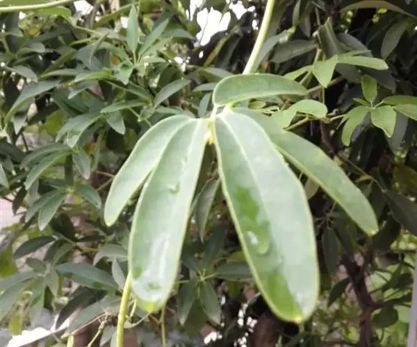 常绿木质藤本。茎与枝圆柱形,灰褐色,具线纹。掌状复叶有小叶(3)5-7(9)片;叶柄长2-5厘米;小叶近革质或革质,线状长圆形、长圆状披针形至倒披针形,长5-9(11)厘米,宽1.2-2(3)厘米,先端渐尖、急尖、钝或圆,有时凹入,基部钝、阔楔形或近圆形,边缘略背卷,上面绿色,有光泽,下面苍白色密布极微小的乳凸;中脉在上面凹陷,在下面凸起,侧脉每边6-10条,与基出2脉均至近叶缘处弯拱网结;网脉和侧脉在两面均明显凸起或在上面不显著在下面微凸起;小叶柄长5-25毫米。