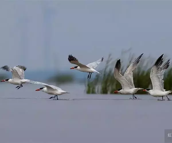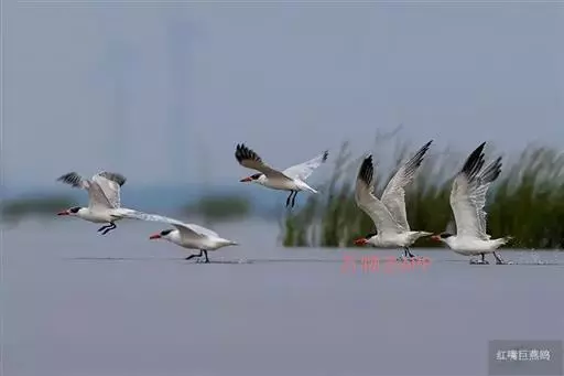 红嘴巨鸥(学名:Sterna caspia),大型水鸟,体长47~55厘米。夏羽前额、头顶、枕和冠羽黑色。后颈、尾上覆羽和尾白色,尾呈叉状。背、肩和翅上覆羽银灰色。眼先和眼及耳羽以下头侧白色;颏、喉和整个下体也为白色。冬羽和夏羽大致相似,但额和头顶白色,具黑色纵纹。有些头全为白色,仅耳区有黑色斑。上体较淡。主要栖息于海岸沙滩、平坦泥地、岛屿和沿海沼泽地带。常成小群在一起营巢,很少单独成对营巢的。卵的颜色为赭色、绿白色、赭白色或淡褐色,被有淡褐色或黑色斑点。