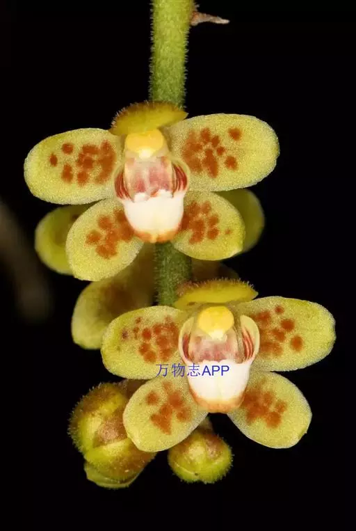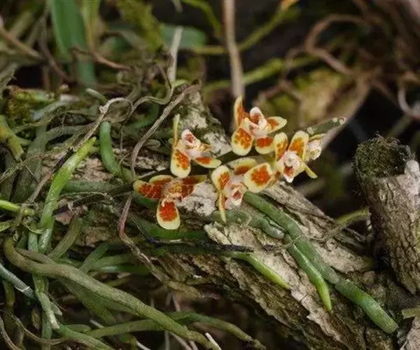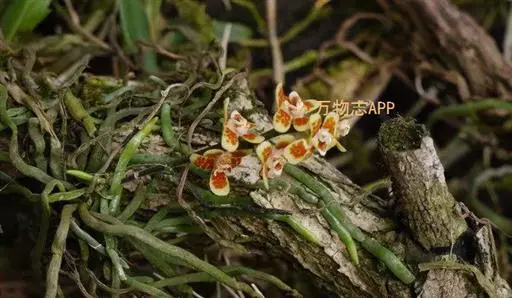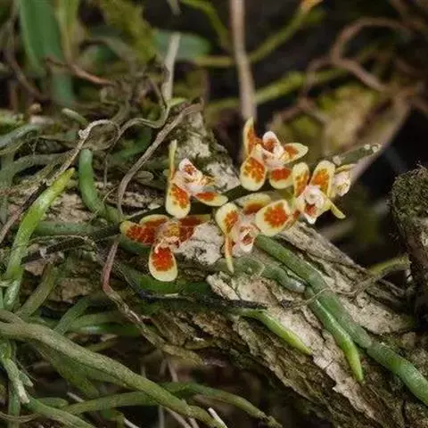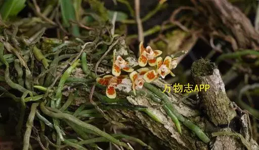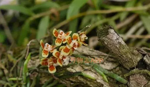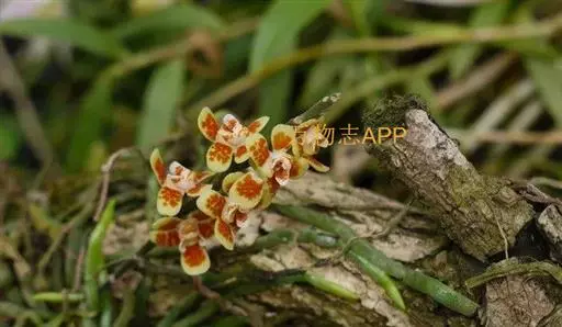 异型兰(学名:Chiloschista yunnanensis Schltr.):茎不明显,通常无叶,至少在花期时无叶。花序1-2个,下垂,不分枝,疏生多数花;花苞片膜质,卵状披针形,长3-4毫米,先端短急尖,具1条脉,背面疏生短硬毛;花质地稍厚,萼片和花瓣茶色或淡褐色,除基部外周边为浅白色,具5条脉,背面密布短毛;唇瓣黄色,贴生于蕊柱足末端,3裂。蒴果圆柱形,稍弧形弯曲。花期3-5月,果期7月。