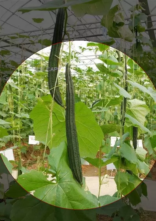 广东丝瓜(Luffa acutangula (L.) Roem.)葫芦科一年生草质攀援藤本;茎稍粗壮,具明显的棱角,被短柔毛。卷须粗壮,下部具棱,常3歧,有短柔毛。叶柄粗壮,棱上具柔毛;叶片近圆形,膜质,中间裂片稍长,上面深绿色,粗糙,下面苍绿色。雌雄同株;总花梗有白色短柔毛;花萼筒钟形,外面有短柔毛;花冠黄色,辐状,裂片倒心形,顶端凹陷,两面近无毛,外面具3条隆起脉,脉上有短柔毛;雄蕊3,离生,1枚1室,2枚2室,花丝基部有髯毛,花药有短柔毛。雌花:单生。果实圆柱状或棍棒状,无毛。种子卵形,黑色,有网状纹饰,无狭翼状边缘,基部2浅裂。花果期:夏、秋季。