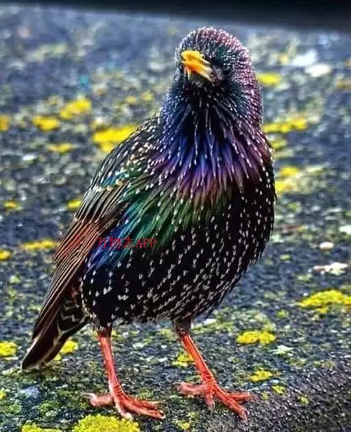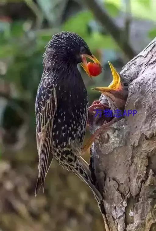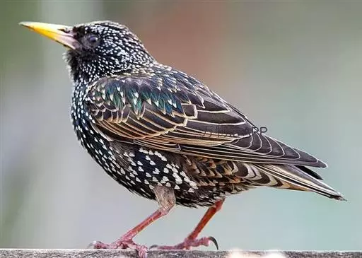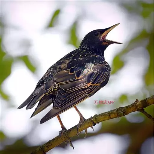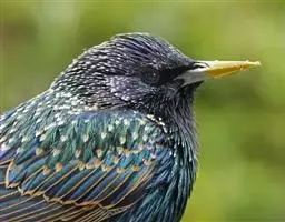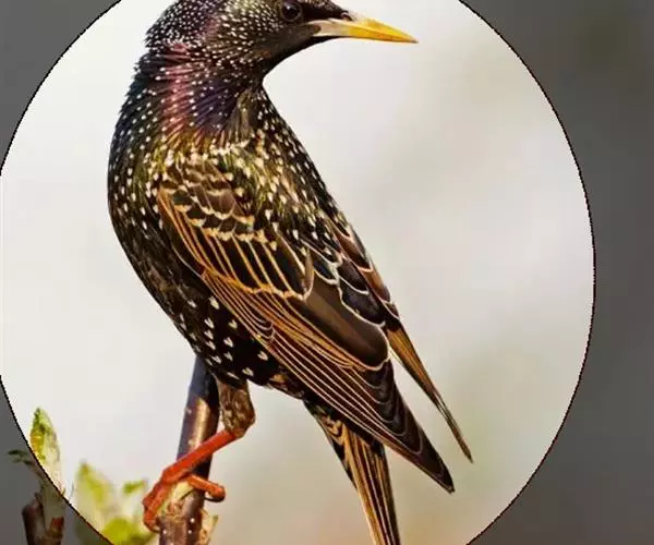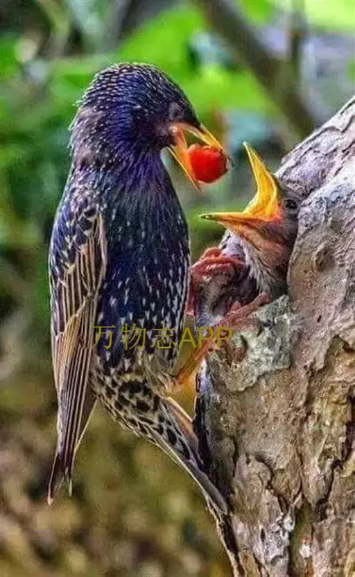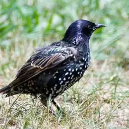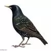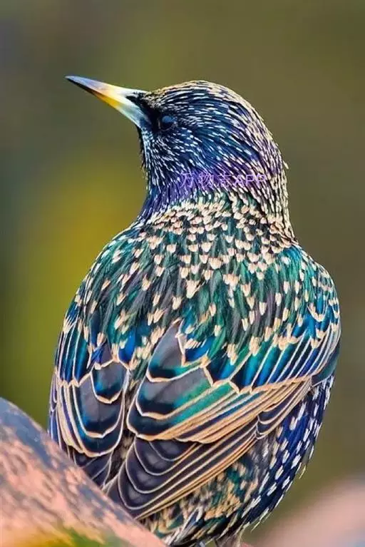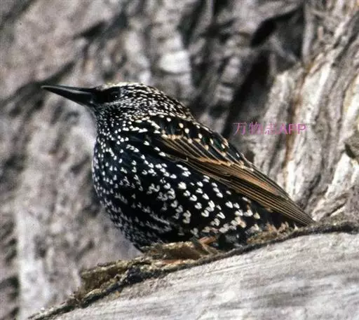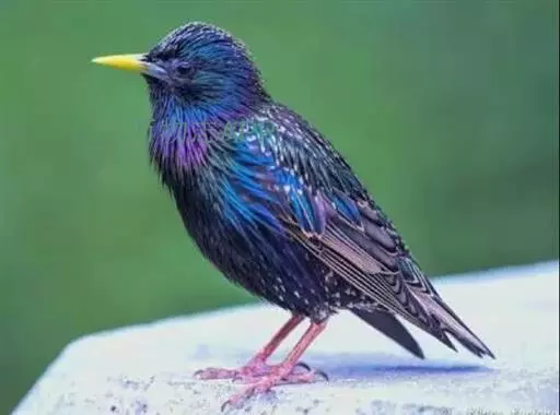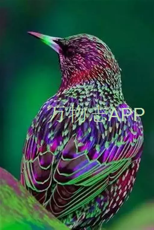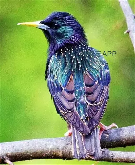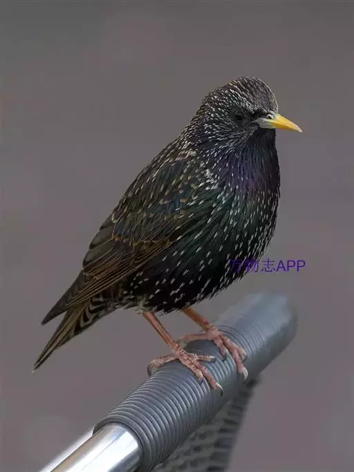 紫翅椋鸟(学名:Sturnus vulgaris):全长约20-24厘米,是中等体型的椋鸟。体羽新时为矛状,羽缘锈色而成扇贝形纹和斑纹,旧羽斑纹多消失。闪辉黑、紫、绿色。具不同程度白色点斑。虹膜深褐色;嘴黄色;脚略红。