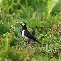 斑椋鸟:是中等体型的黑白色椋鸟,体长24厘米。头顶、头侧、翼斑、腰及腹部白色,喉、胸及上体余部黑色,…