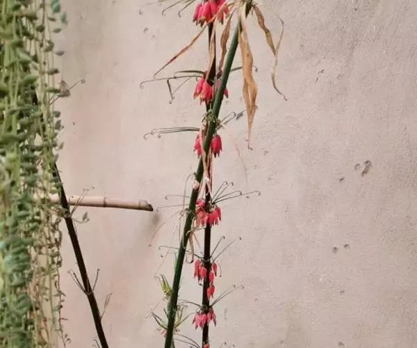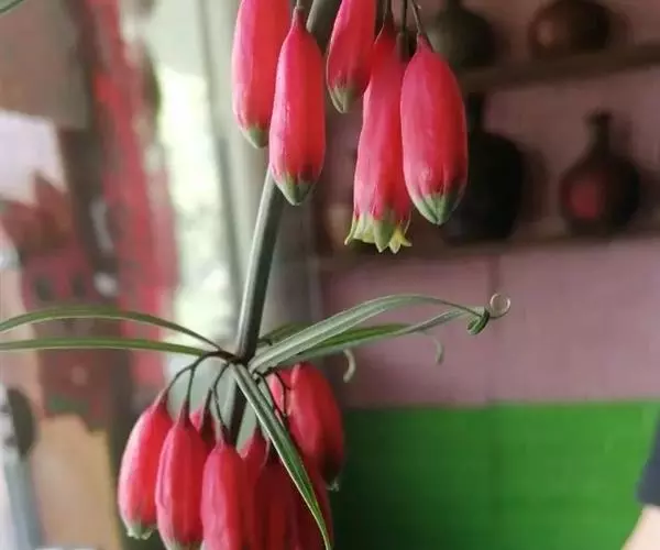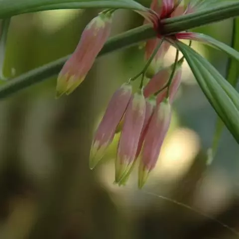花序具(1-)2-4(-6)花,总花梗下垂,长1-2厘米,花梗长0.5-1.5厘米,苞片膜质,微小,通常位于花梗下部;花被粉红色,长18-25毫米,裂片长3-5毫米;花丝长3-5毫米,丝状或两侧扁,花药长4-6毫米;子房长4-6毫米,花柱长(8-)10-14毫米。