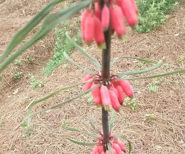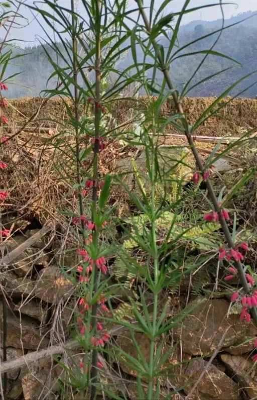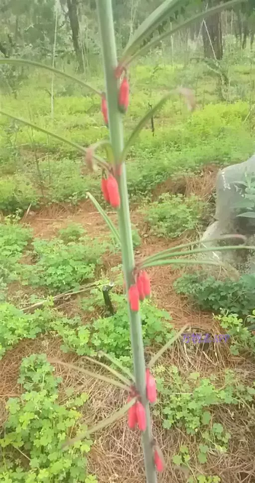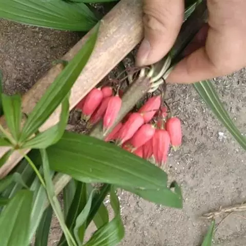 滇黄精(Polygonatum kingianum Coll. et Hemsl)百合科黄精属草本植物,根状茎近圆柱形或近连珠状,结节有时作不规则菱状,肥厚。茎顶端作攀援状。叶轮生,每轮3-10枚,条形、条状披针形或披针形,先端拳卷。花序具花,总花梗下垂,花梗苞片膜质,微小,通常位于花梗下部;花被粉红色,裂片长3-5毫米;花丝长3-5毫米,丝状或两侧扁,花药长4-6毫米;子房长4-6毫米。浆果红色,直径1-1.5厘米,具7-12颗种子。花期3-5月,果期9-10月。