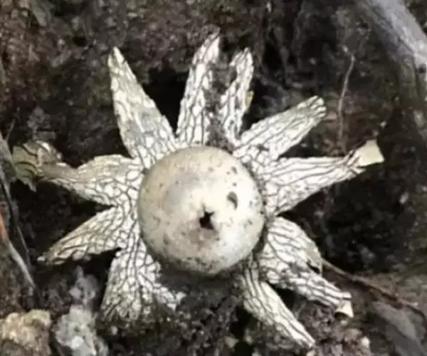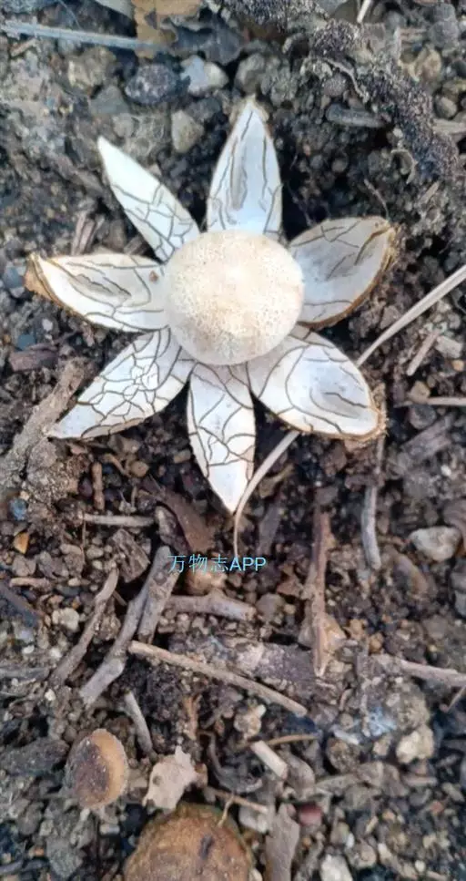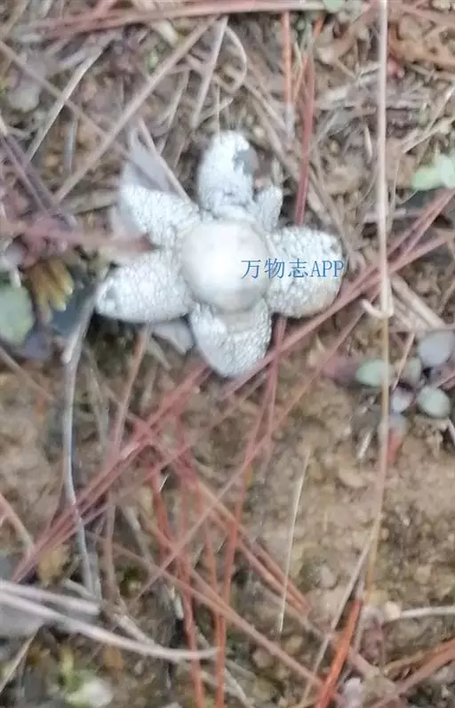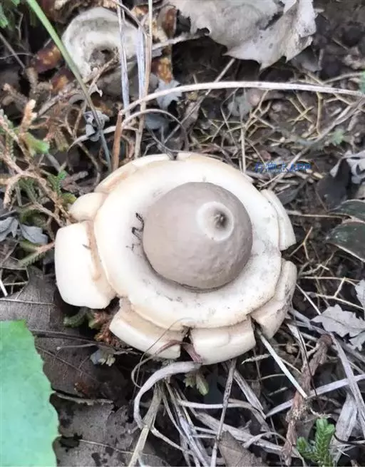 2、尖顶地星:又名土星菌、米屎疏。包被呈圆球形,顶部具一尖喙。包被径3-8cm,外包被呈芒状开裂5-8瓣,背面灰色,腹面肉桂色,有龟裂。内包被灰色,薄膜状,直径1.7-2.7cm。成熟时顶端开裂。孢体锈褐色,基部有短柄状的轴托。孢子球形,褐色,有疣突,3.5-5.5μm。孢丝线状,淡褐色,径5-6μm。