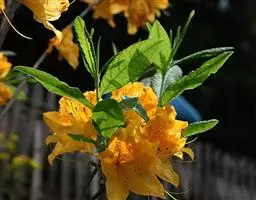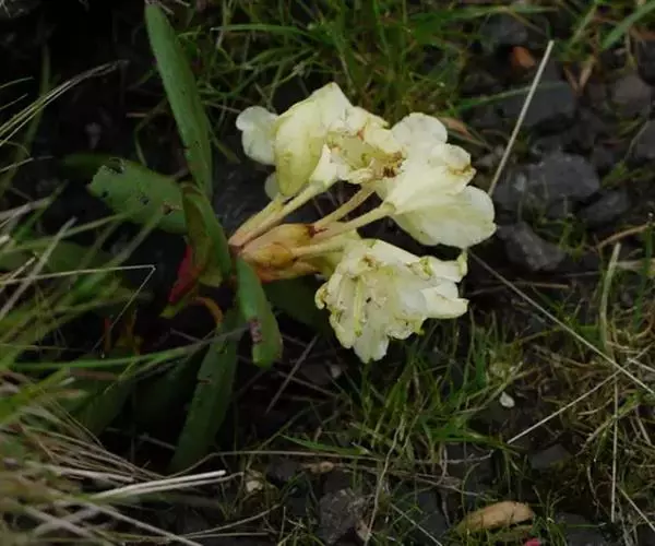 牛皮杜鹃(学名:Rhododendron aureum Georgi):常绿矮小灌木,高10-50厘米。茎横生,侧枝斜升,具宿存的芽鳞。叶革质,常4-5枚集生于小枝顶端,倒披针形或倒卵状长圆形,上面暗绿色,下面淡绿色。顶生伞房花序,有花5-8朵;花冠钟形,长2.5-3厘米,淡黄色,5裂,裂片近于圆形,稍不等大,上方一片具红色斑点。蒴果长圆柱形。花期5-6月,果期7-9月。