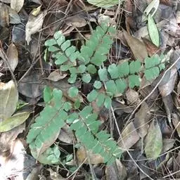 叶远生或近生;柄长5-20厘米,粗约1毫米,纤细,栗黑色,有光泽,基部被与根状茎上同样的鳞片,向上光滑,叶片卵状三角形,长10-25厘米,宽8-16厘米,尖头,基部楔形,中部以下多为二回羽状,中部以上为一回奇数羽状;羽片3-5对,互生,斜向上,有柄(长可达1.5厘米),基部一对较大,长4.5-9厘米,宽2.5-4厘米,长圆状卵形,圆钝头,一回(少二回)奇数羽状,侧生末回小羽片2-4对,互生,斜向上,相距6-15毫米,大小几相等或基部一对略大,对称或不对称的斜扇形或近斜方形,长1.2-2厘米,宽1-1.5厘米,上缘圆形,具2-4浅裂或深裂成条状的裂片,不育裂片先端钝圆形,具阔三角形的小锯齿或具啮蚀状的小齿,能育裂片先端截形、直或略下陷,全缘或两侧具有啮蚀状的小齿,两侧全缘,基部渐狭成偏斜的阔楔形,具纤细栗黑色的短柄(长1-2毫米),顶生小羽片扇形,基部为狭楔形,往往大于其下的侧生小羽片,柄可达1厘米;第二对羽片距基部一对2.5-5厘米,向上各对均与基部一对羽片同形而渐变小。叶脉多回二歧分叉,直达边缘,两面均明显。叶干后薄草质,草绿色或褐绿色,两面均无毛;叶轴、各回羽轴和小羽柄均与叶柄同色,往往略向左右曲折。