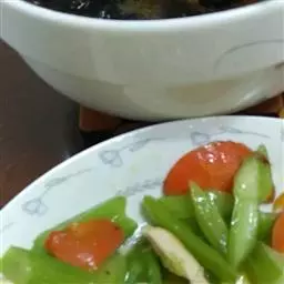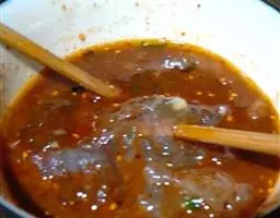 1、将调味料1用果汁机打成泥状(可加入少许色拉油)。油豆腐切片备用。
