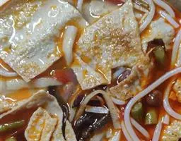 2、将锅烧热,加入少许油,将调味料1炒香,再将调味料2加入,转中火,要一直搅拌汤料,避免烧焦。煮沸后放入草虾、油豆腐片、鱼丸煮熟,再加入米粉同煮,熟后盛入碗中。